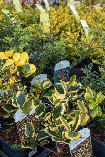 Holly – variegated hollies like ‘Golden King’ add structure to pots and gardens