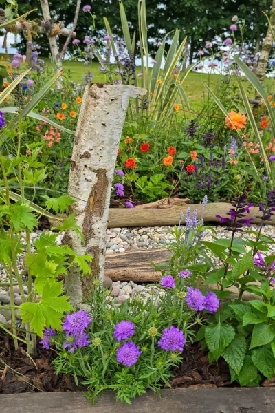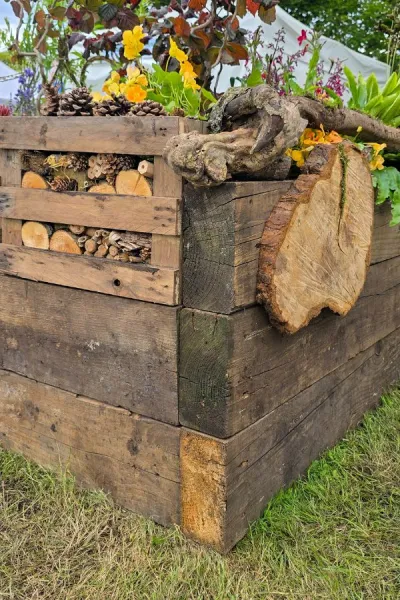 There were logs and wood on many show gardens and borders. They were garden ornaments, trellis, edging, for raised beds, pavers, obelisks, as vertical interest and as bug hotels.