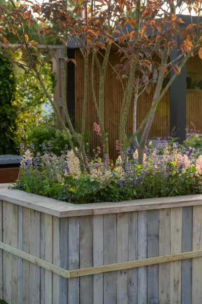 Dark green raised beds in this Landform Mental Wealth Garden designed by Nicola Hale. It also has hazel and willow fencing – seen in several gardens at RHS Hampton Court 2023, because these are sustainable materials.