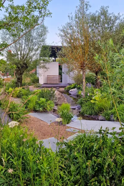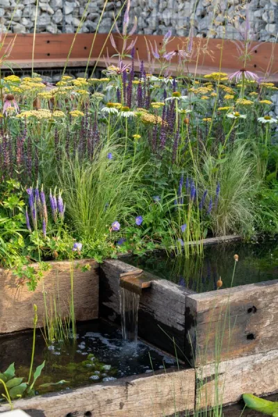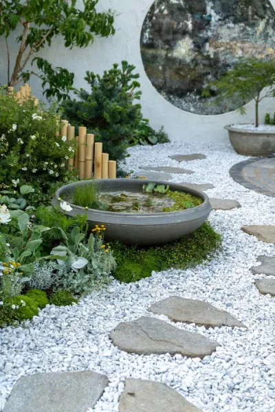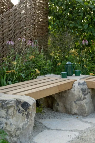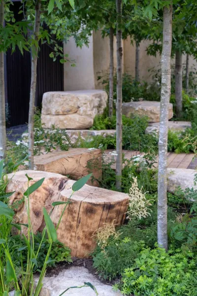 Several show gardens at RHS Hampton Court 2023 featured rocks as water features, sculpture, seating and more.