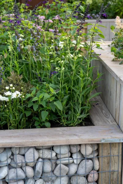 Gabions used as combined raised beds and seating in the Association of Professional Landscapers’ The Devil’s in the Detail Garden.