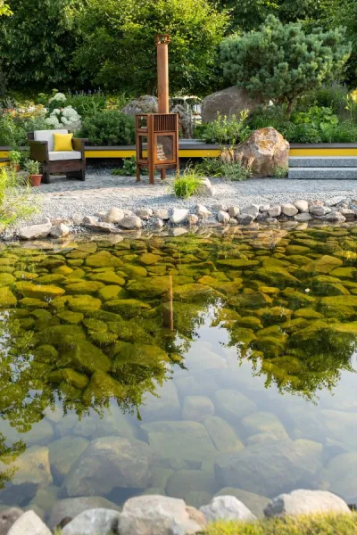 The Hurtigruten Garden by Max Parker-Smith – rocks are used both to define the pool edges and all over the bottom of the pool, as well as to add punctuation points to the planting.