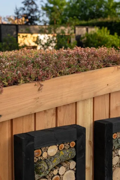 A bin store with a green roof and decorative bug hotel panels on Tom Massey’s Resilience Garden.