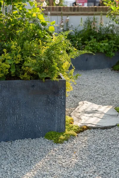 Galvanised metal raised beds in The Wildlife Trust’s Renters Retreat designed by Zoe Claymore.