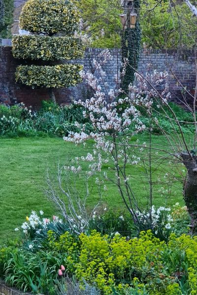 My favourite part of my garden in spring is between a silver birch a cotinus, an amelanchier and an ornamental plum. All lose their leaves in winter, so this area is a riot of bulb colour in spring.