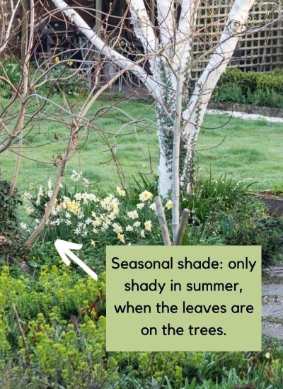 If you have deciduous trees in your border, they will lose their leaves in autumn. They often won’t be fully ‘clothed’ again until late spring or early summer. So this will be a shady border in summer but sunny in spring.