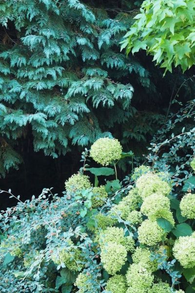 Hydrangea arborescens ‘Annabelle’ grows right up against the conifer in my most shady border. However nothing grows directly under the conifer.