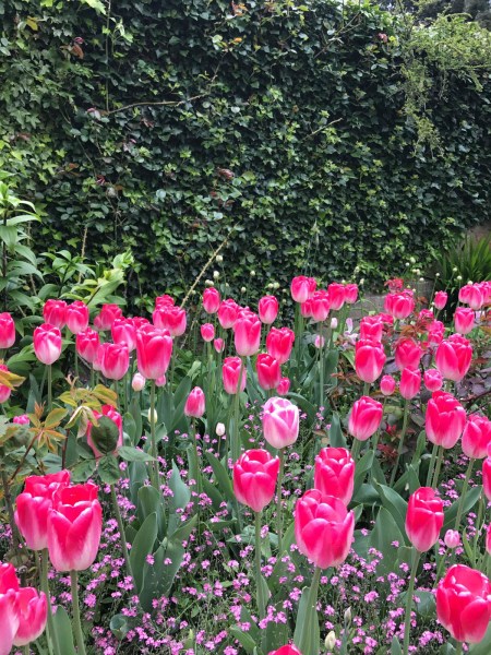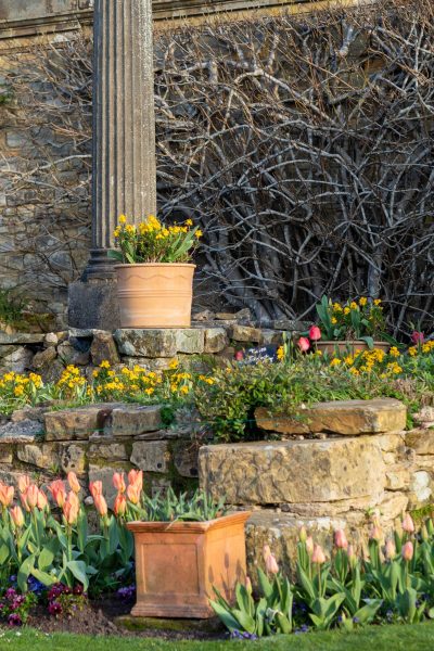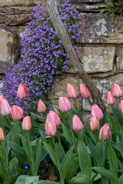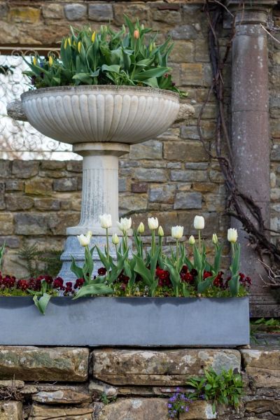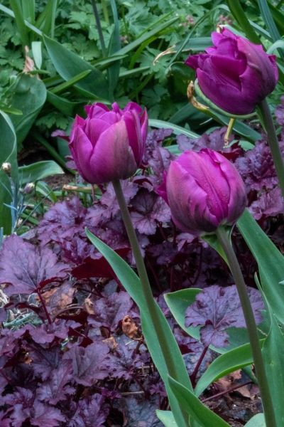 At Hever Castle, there are a number of displays where tulips are combined with either violas or wallflowers. Heuchera are another good partner for tulips.