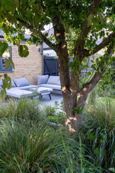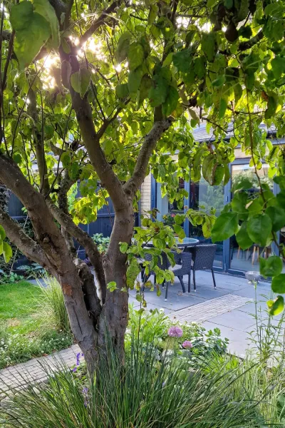 Luckily, Karen and Andrea’s garden had two beautiful mature fruit trees in the centre of the garden. ‘If they hadn’t been there, I’d have had to plant them,’ says Posy.