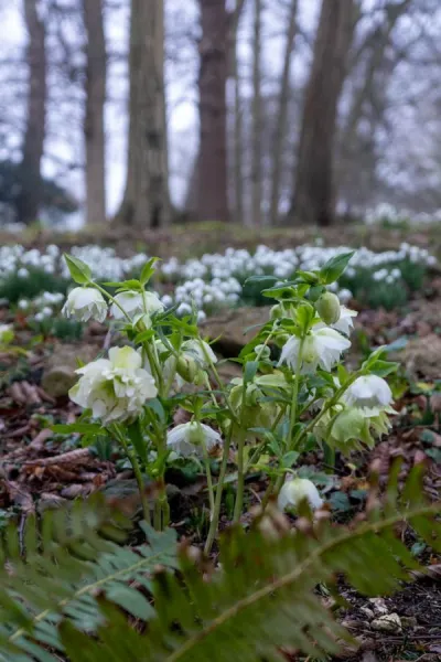Firstly, snowdrops will often grow at the edge of the canopy of an evergreen tree because enough sunlight will usually reach them there.