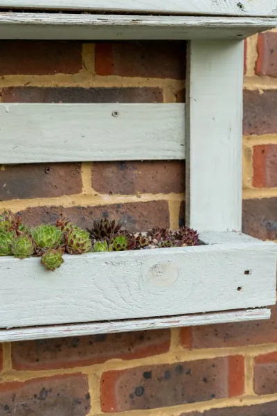 Jo painted this piece of pallet and hung it on the wall. She added a strip of wood to make it into a ‘window basket’ type planter. She then lined it with plastic from an old compost sack. It’s a very shallow planter so she warns that it’s not suitable for plants that need a lot of watering.