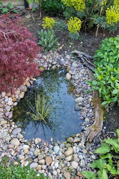 There are some old tree stumps planted with succulents. And she’s also dug a small wildlife pond, lining it with some leftover lining. Her brother had just created a larger pond in his garden, and there was a small piece of lining left over.