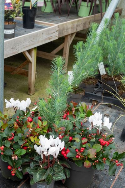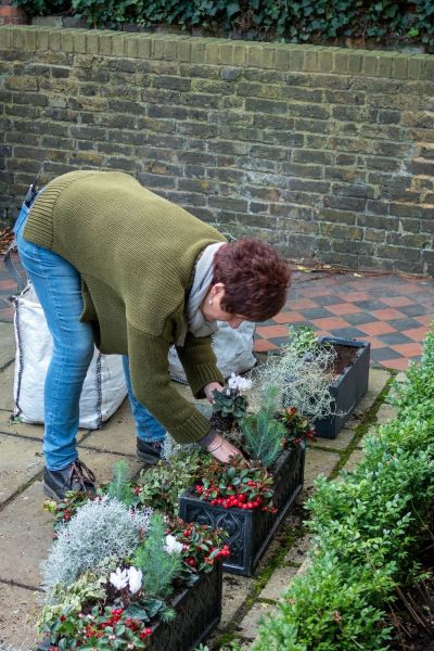 Jane used red cyclamen, silver stone pine (Pineus pinea ‘Silver Crest’) and red-berried Gaultheria (Gaultheria procumbens) for this year’s winter pots and window boxes. ‘The cyclamen will probably flower until late winter or early spring.