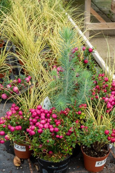 Pink, yellow-green and silver-green. Jane tried out this grouping of pernyetta (Gaultheria mucronata), Golden sedge (Carex aurea) and stone pine (Pinus pinea ‘Silver Crest’) on a shelf at the garden centre, but decided against it. ‘The pink Gaultheria berries won’t last as long as the red ones,’ she said, ‘and if you plant them in the garden afterwards, they probably won’t berry again unless they have a male plant.’